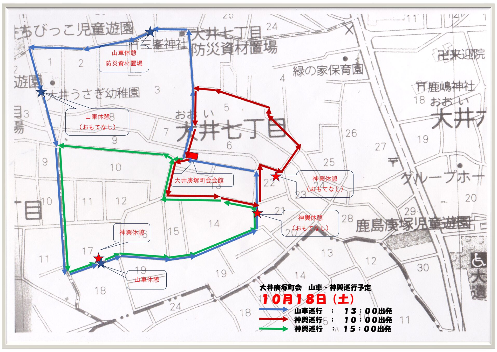 10月18日・19日、恒例の鹿嶋神社例大祭が行われました。町会の睦会が主導でおまつりを進行させたのです。今年は山車の準備が出石町会なので準備が神輿だけとなりました。神輿と山車の巡行予定は以下の巡行予定地図になります。午前中は1回、午後は2回、神輿と山車を交互に巡行させます。