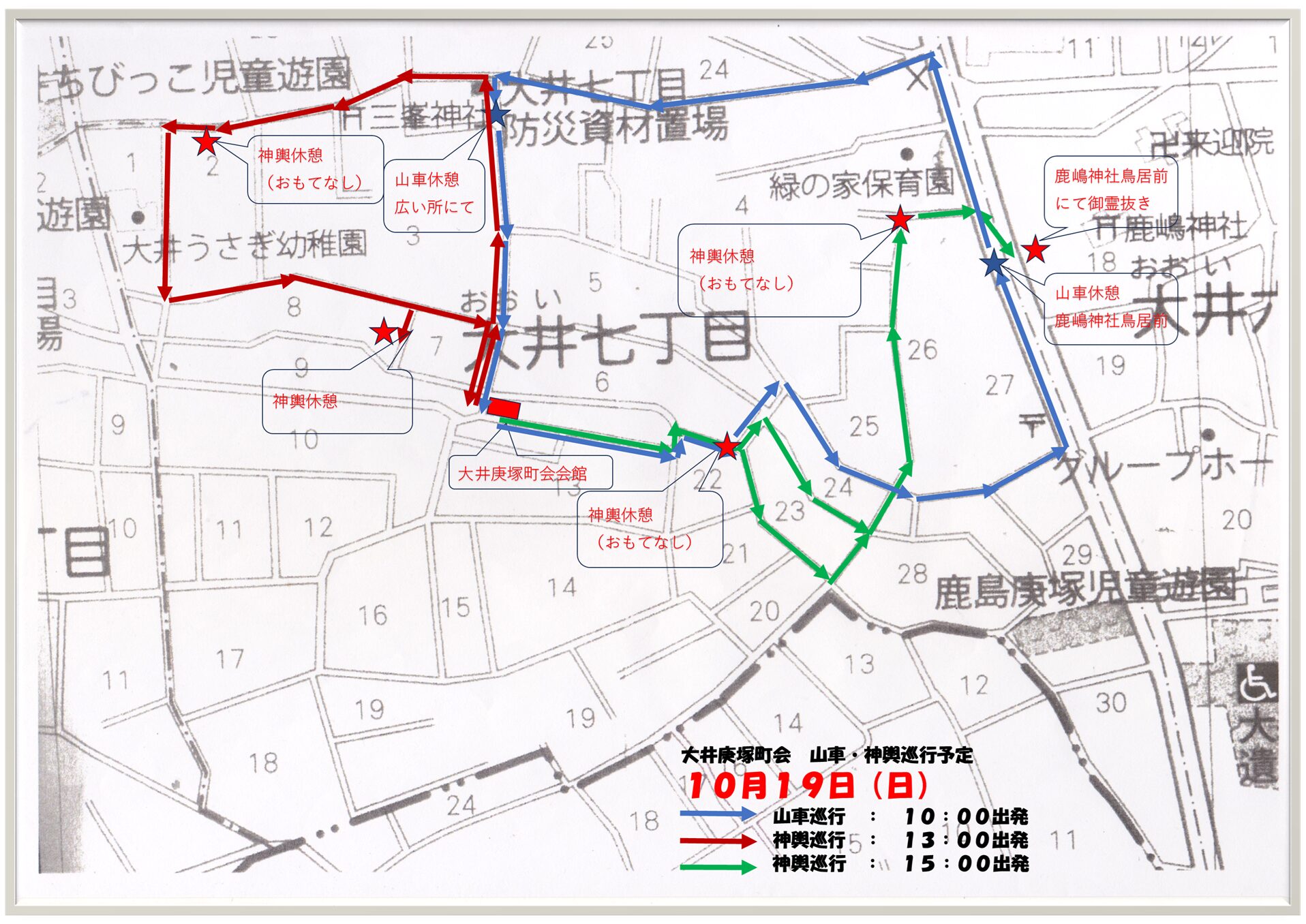 10月18日・19日、恒例の鹿嶋神社例大祭が行われました。町会の睦会が主導でおまつりを進行させたのです。今年は山車の準備が出石町会なので準備が神輿だけとなりました。神輿と山車の巡行予定は以下の巡行予定地図になります。午前中は1回、午後は2回、神輿と山車を交互に巡行させます。