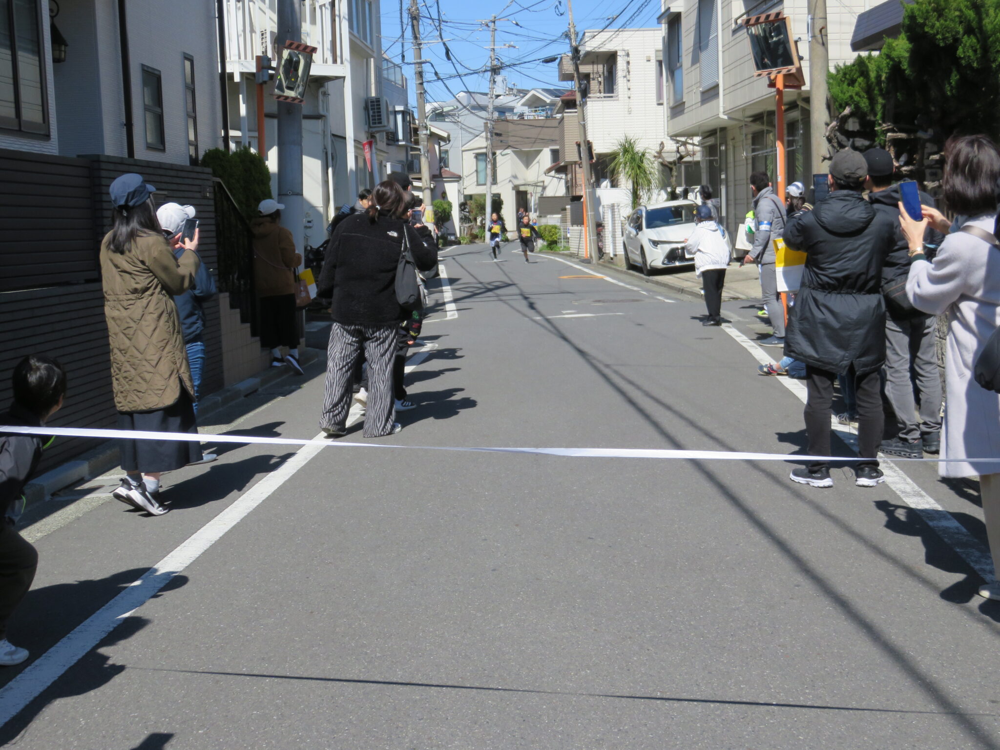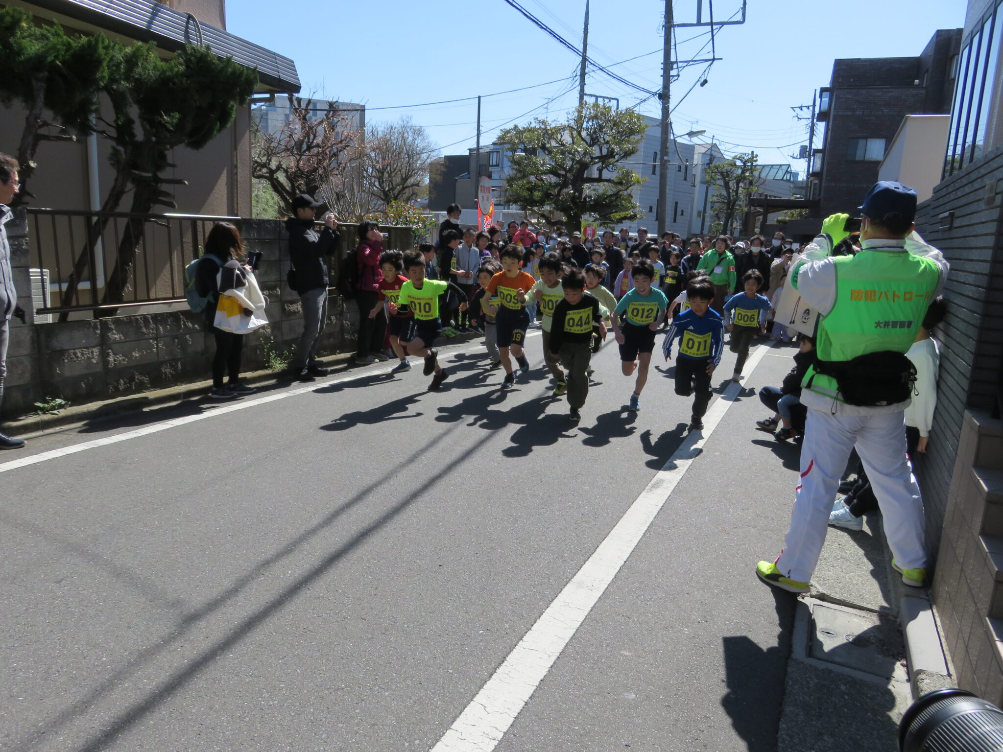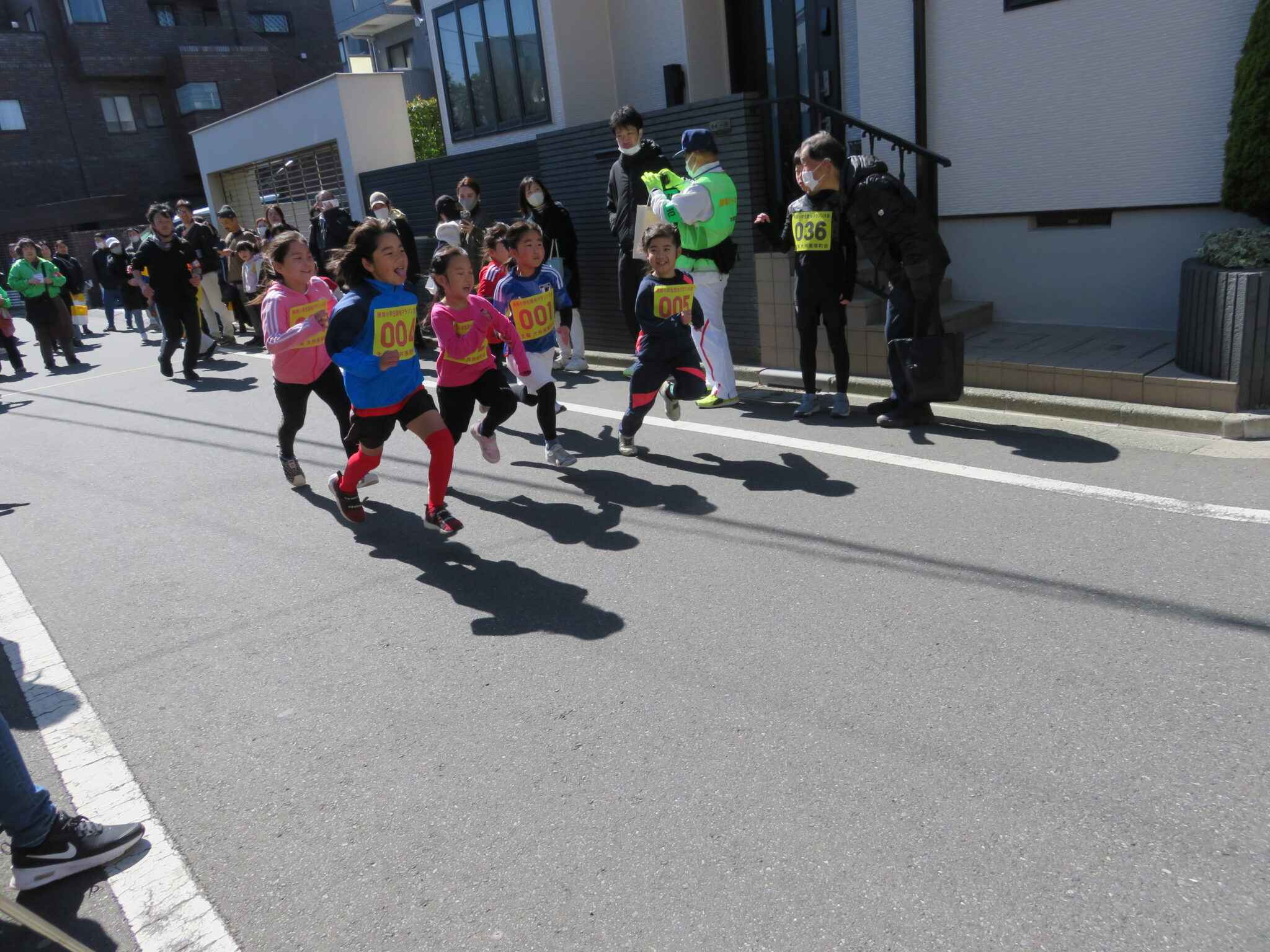 大井第一小学校の校長先生のスターターにより各学年ごとにスタートしたのですが、町内の狭い道路を10人以上の生徒が一斉に競争するのです、父兄など大人は「凄い迫力!!」とビックリしていました。そして各学年ごとに戻ってくる選手達、余裕でトップな子も居れば、3・4年女子のトップ争いは最後まで競っていて迫力のゴールシーンとなりました。