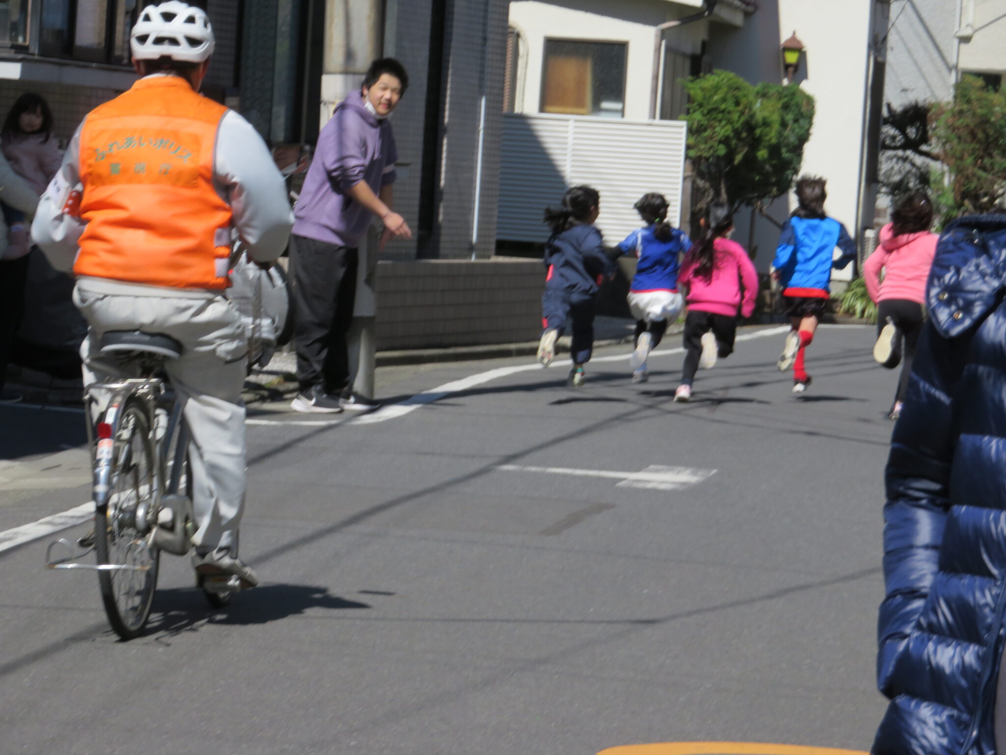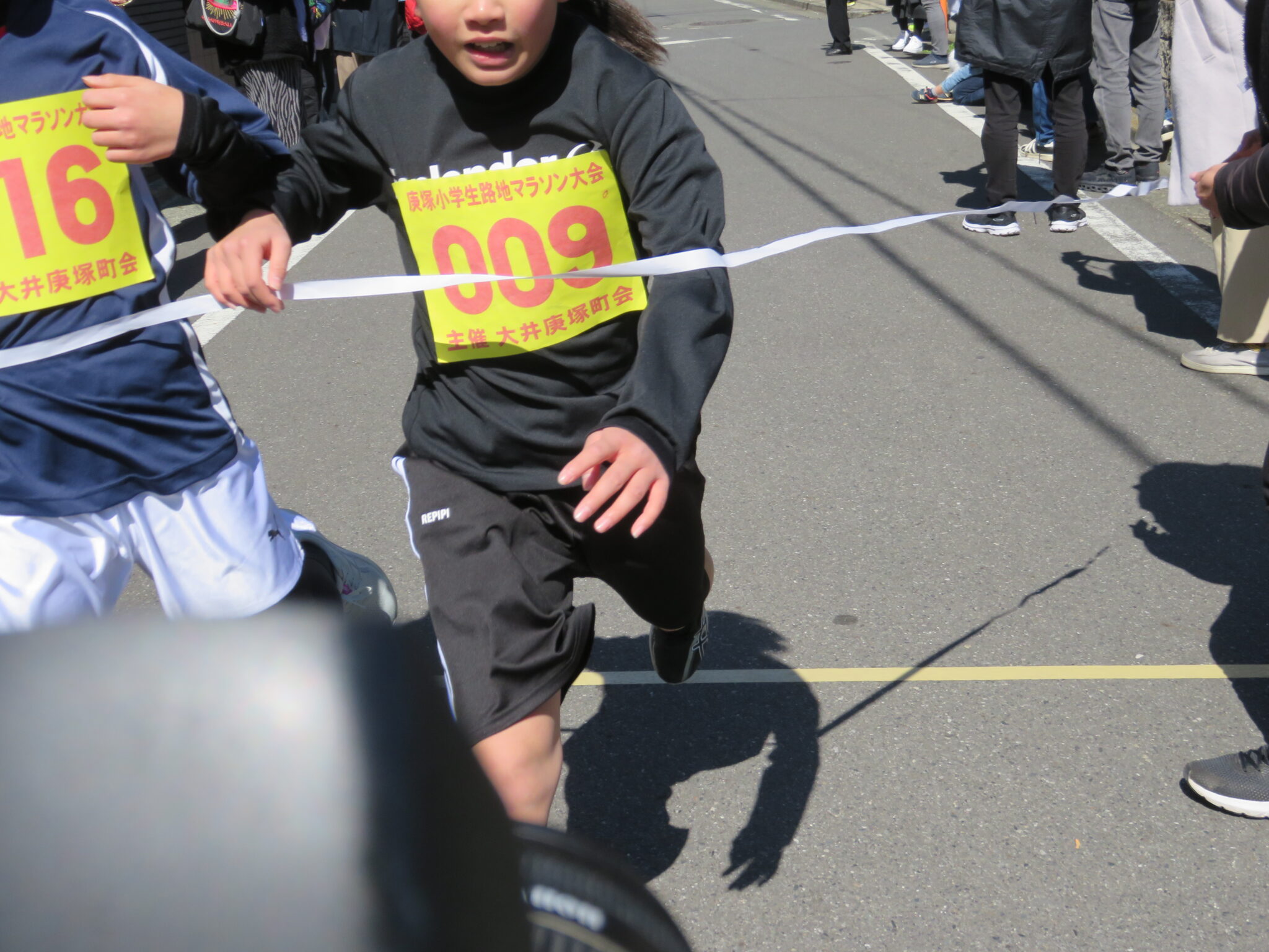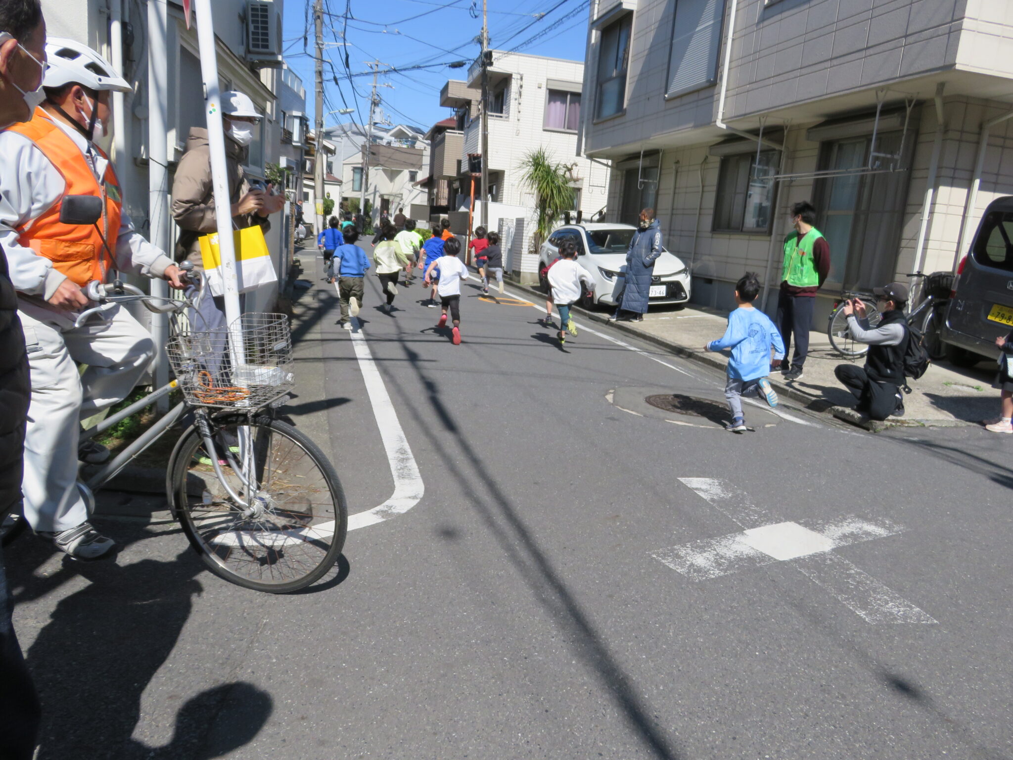 大井第一小学校の校長先生のスターターにより各学年ごとにスタートしたのですが、町内の狭い道路を10人以上の生徒が一斉に競争するのです、父兄など大人は「凄い迫力!!」とビックリしていました。そして各学年ごとに戻ってくる選手達、余裕でトップな子も居れば、3・4年女子のトップ争いは最後まで競っていて迫力のゴールシーンとなりました。