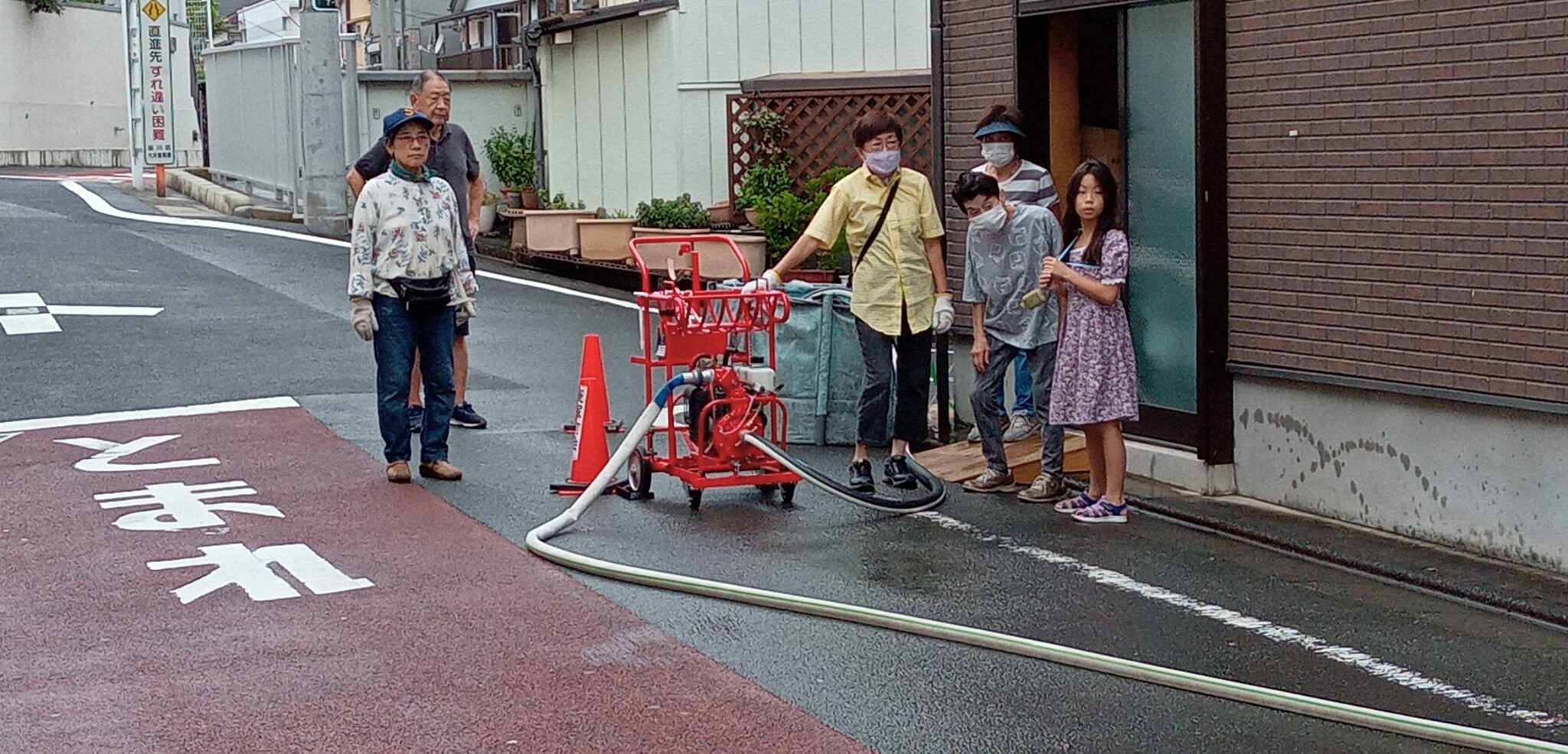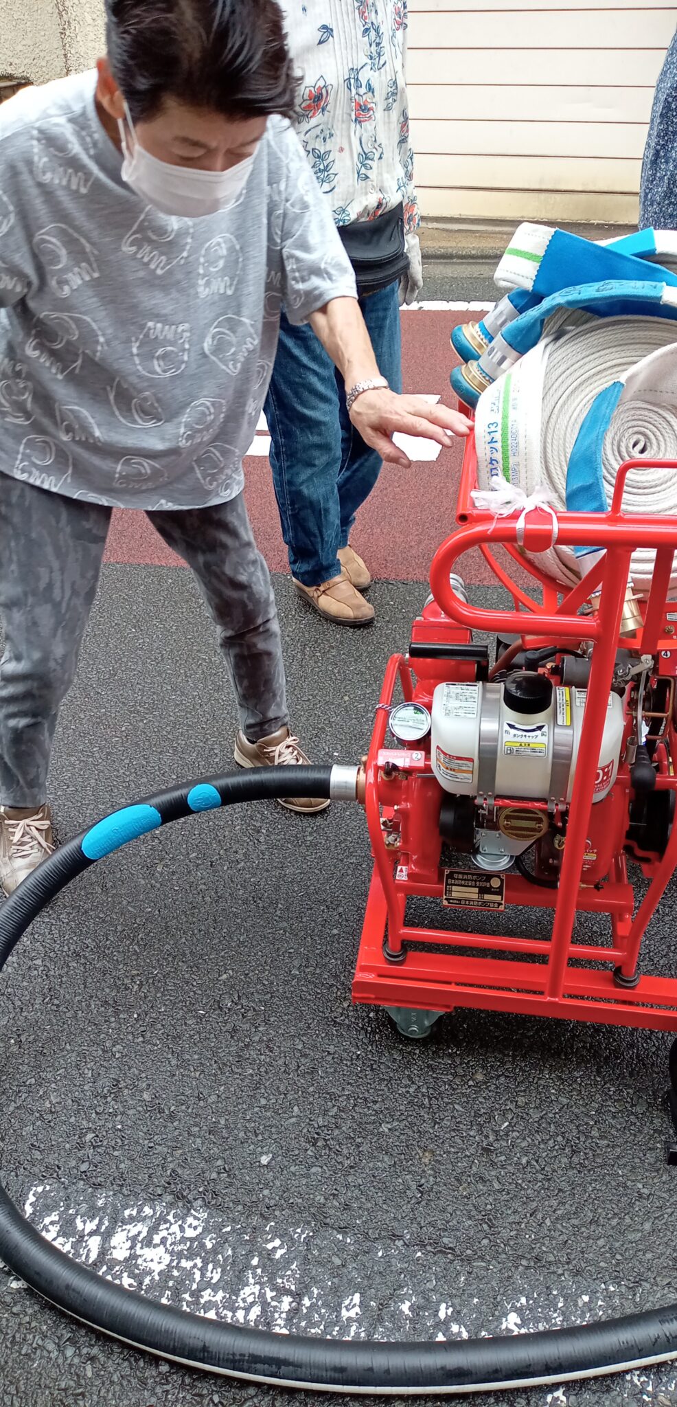 最後は防災区民組織のポンプ放水訓練です。我大井庚塚町会はミニポンプです。我町会の品川区議率いるミニポンプ隊、昨日と先週の2回の練習の結果か、完璧で美しい放水が完成しました。