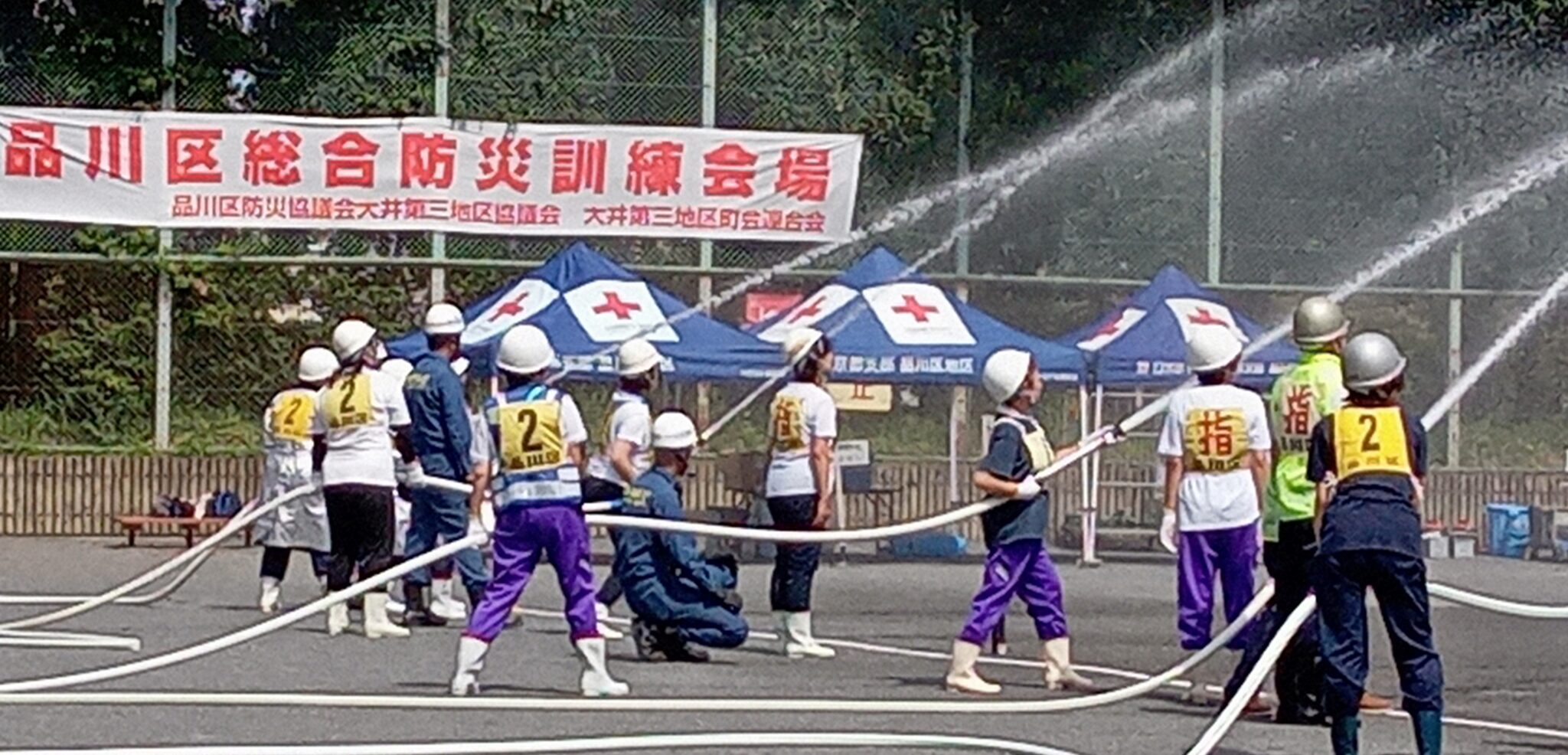 いよいよ総合防災訓練当日となりました。朝早くから町会役員、ボランティア会員が参集し、既に用意されたミニポンプなど防災資材を会場である西大井広場へと運びました。そして避難訓練を兼ね、参加者はロープを掴んで列を作って西大井広場へと向かったのです。朝とは言え、晴天の今日この頃、異常な暑さに見舞われて到着時には汗びっしょりな状態となってしまいました。