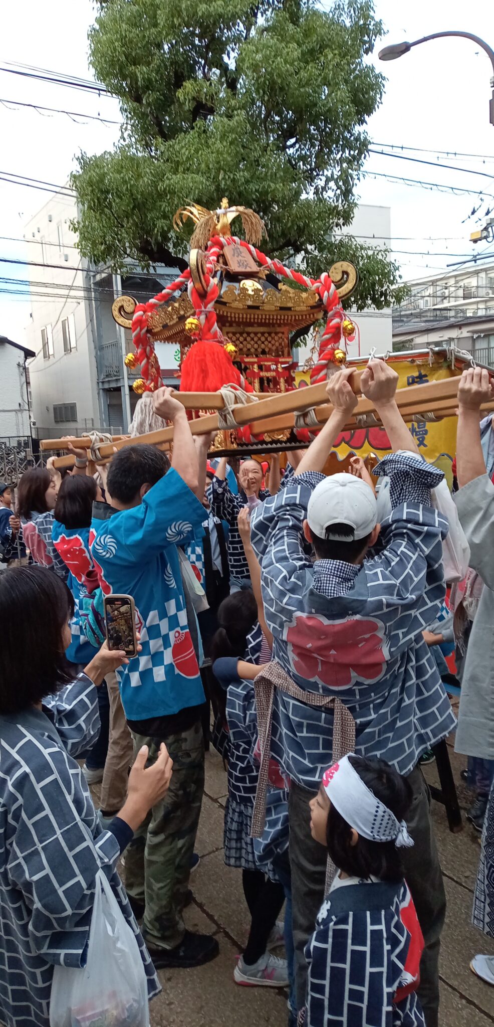 台車に乗せた子供神輿、最後にちょっとだけお手伝いのお母さん方が担ぎました。ちょうど同じ頃、他町会では女神輿が出ているのですが、我町会でも一瞬のお母さん神輿となりました。
