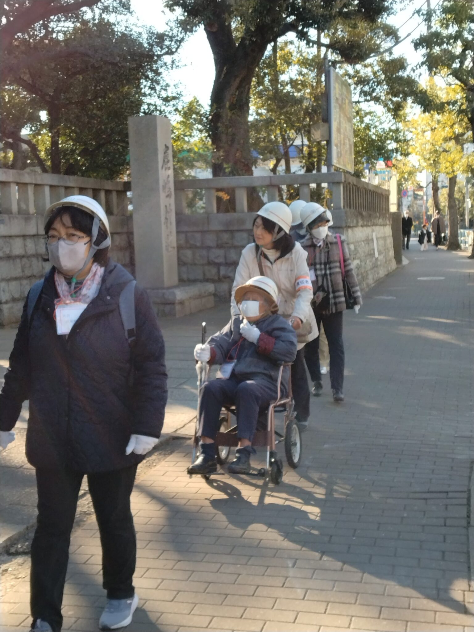 避難される方には車椅子の必要な必要な人も居ます。車椅子も隊列を組んで移動しました。