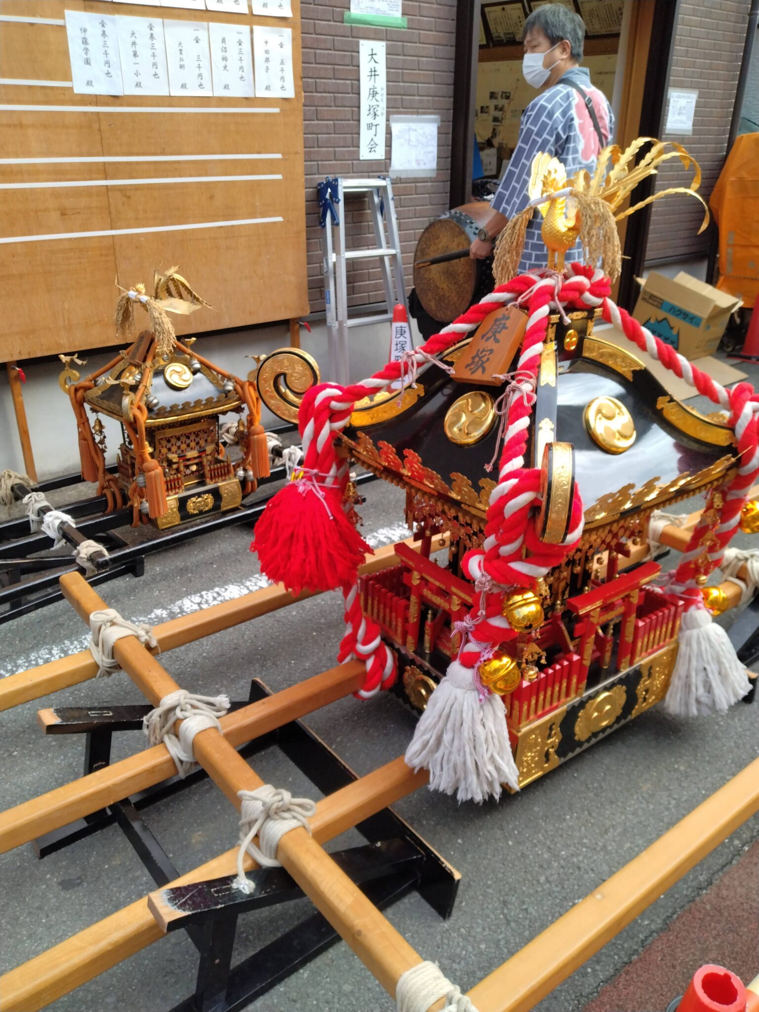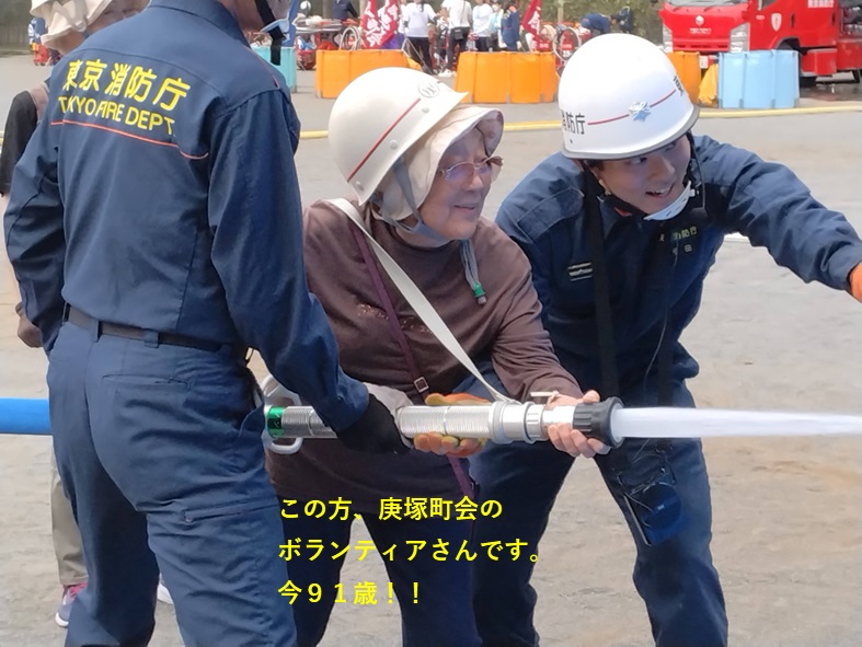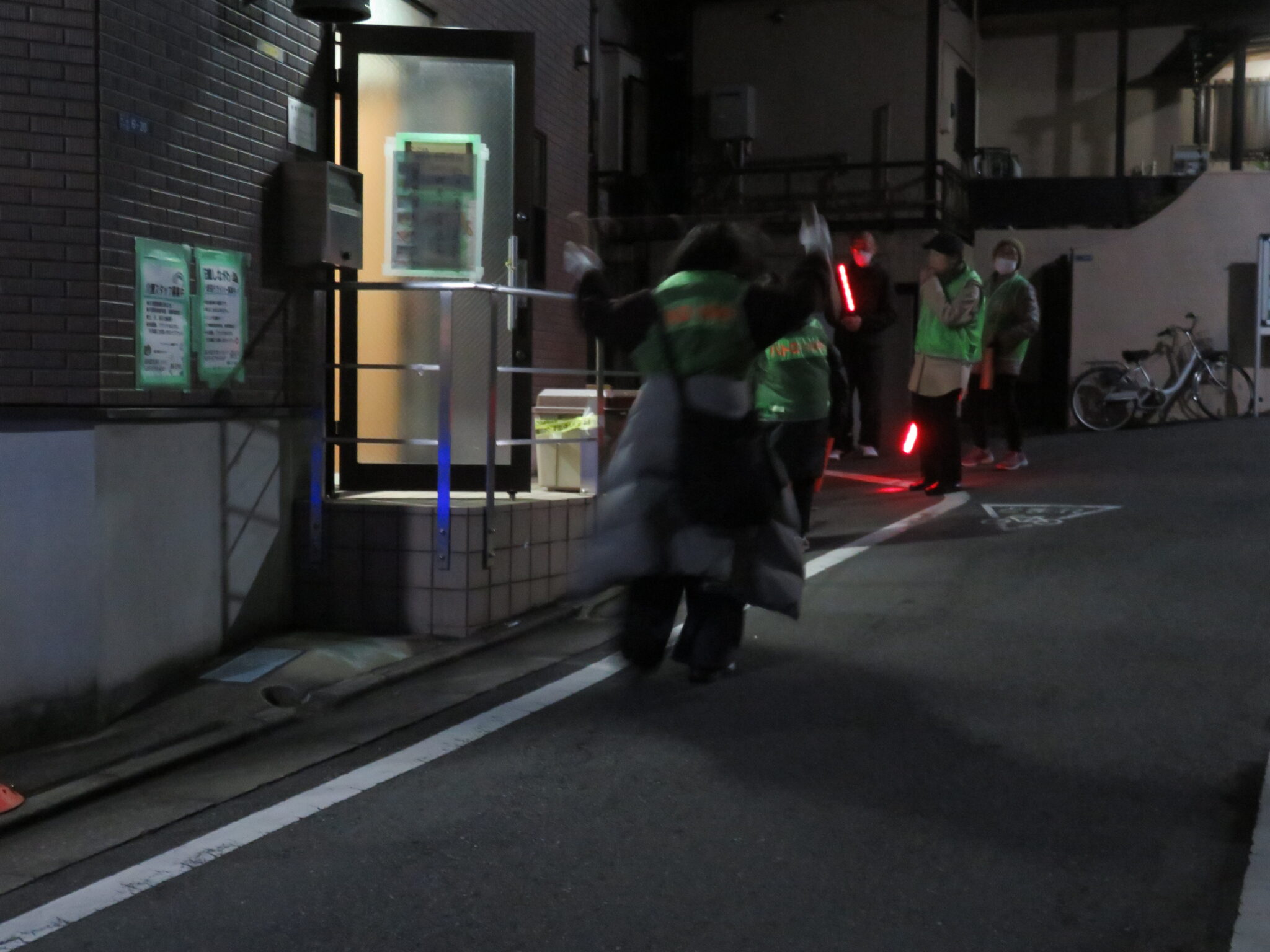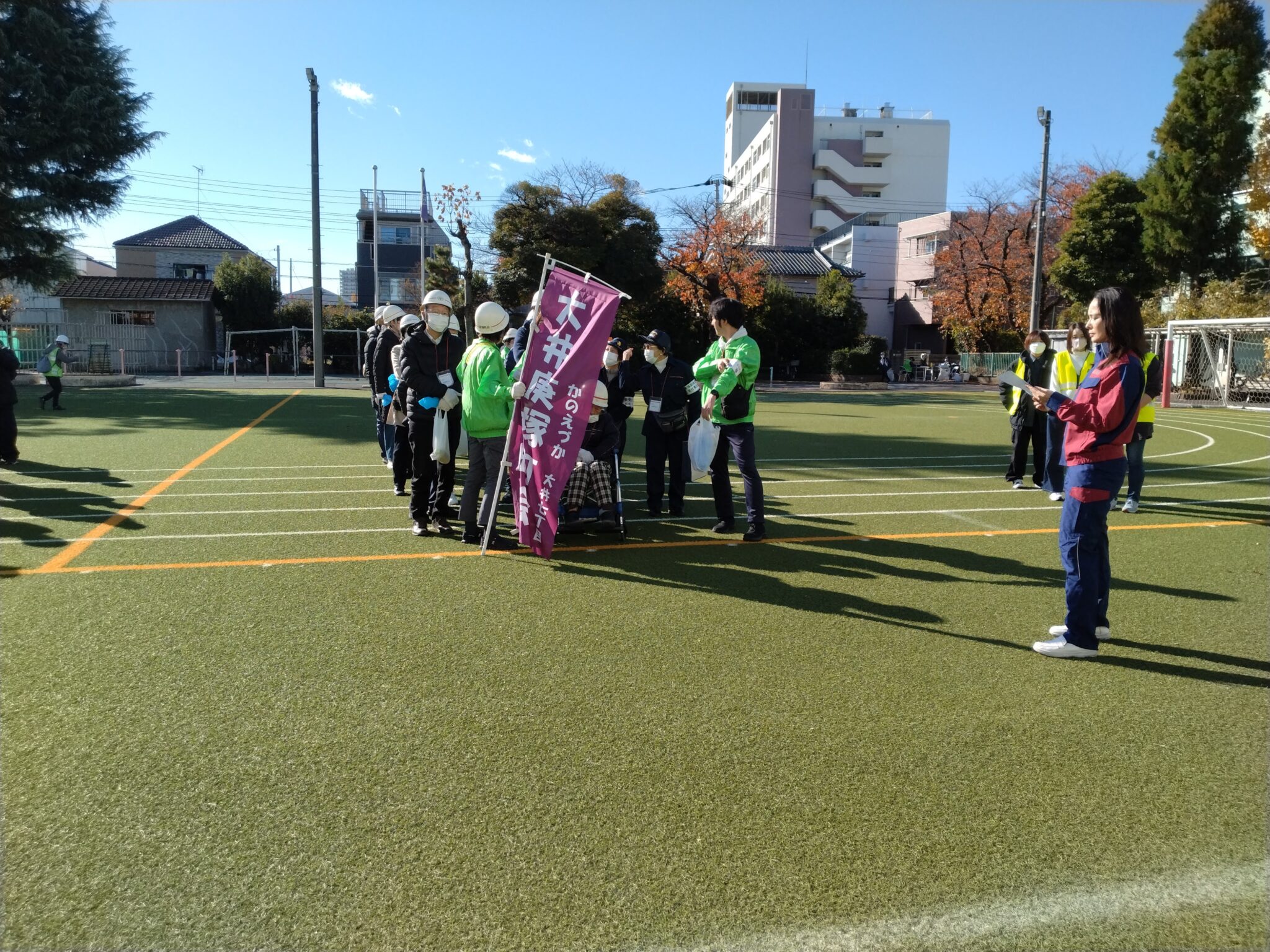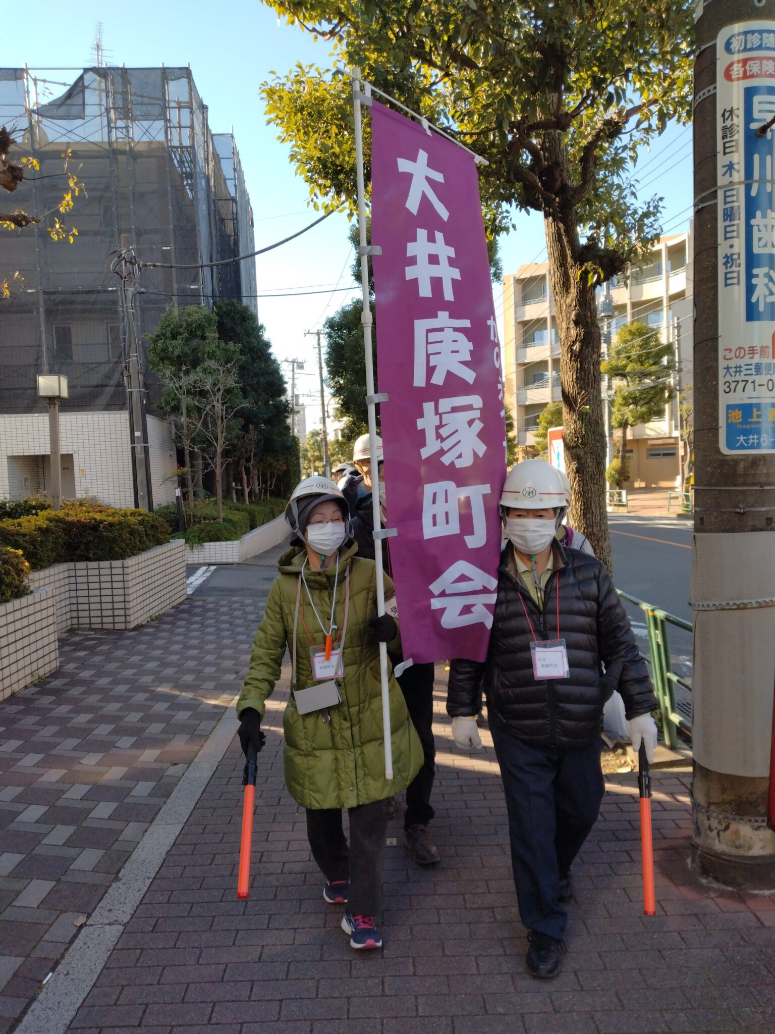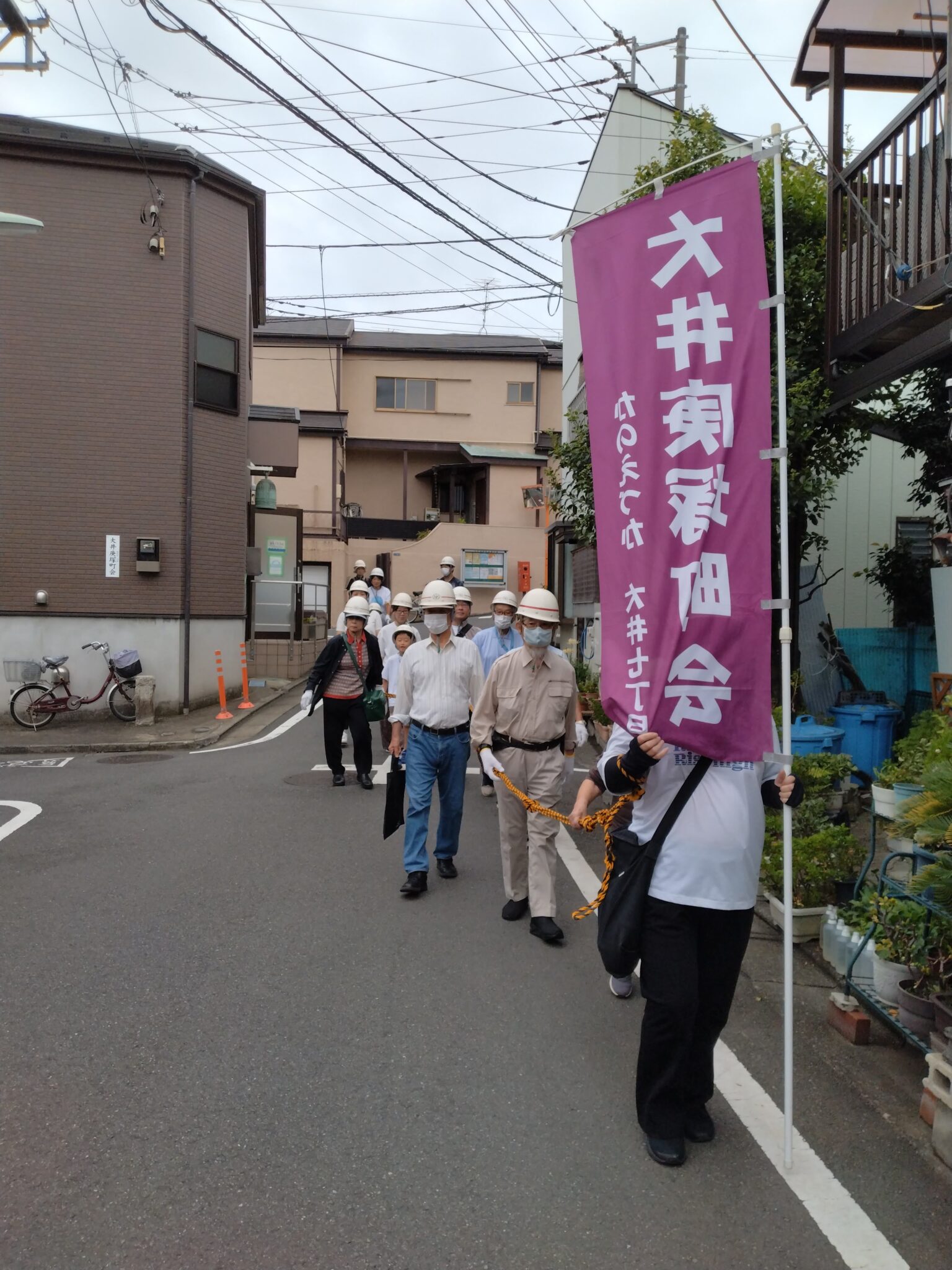 庚塚町会会館で、参加者へ大井庚塚町会の一時集合場所を案内していました。