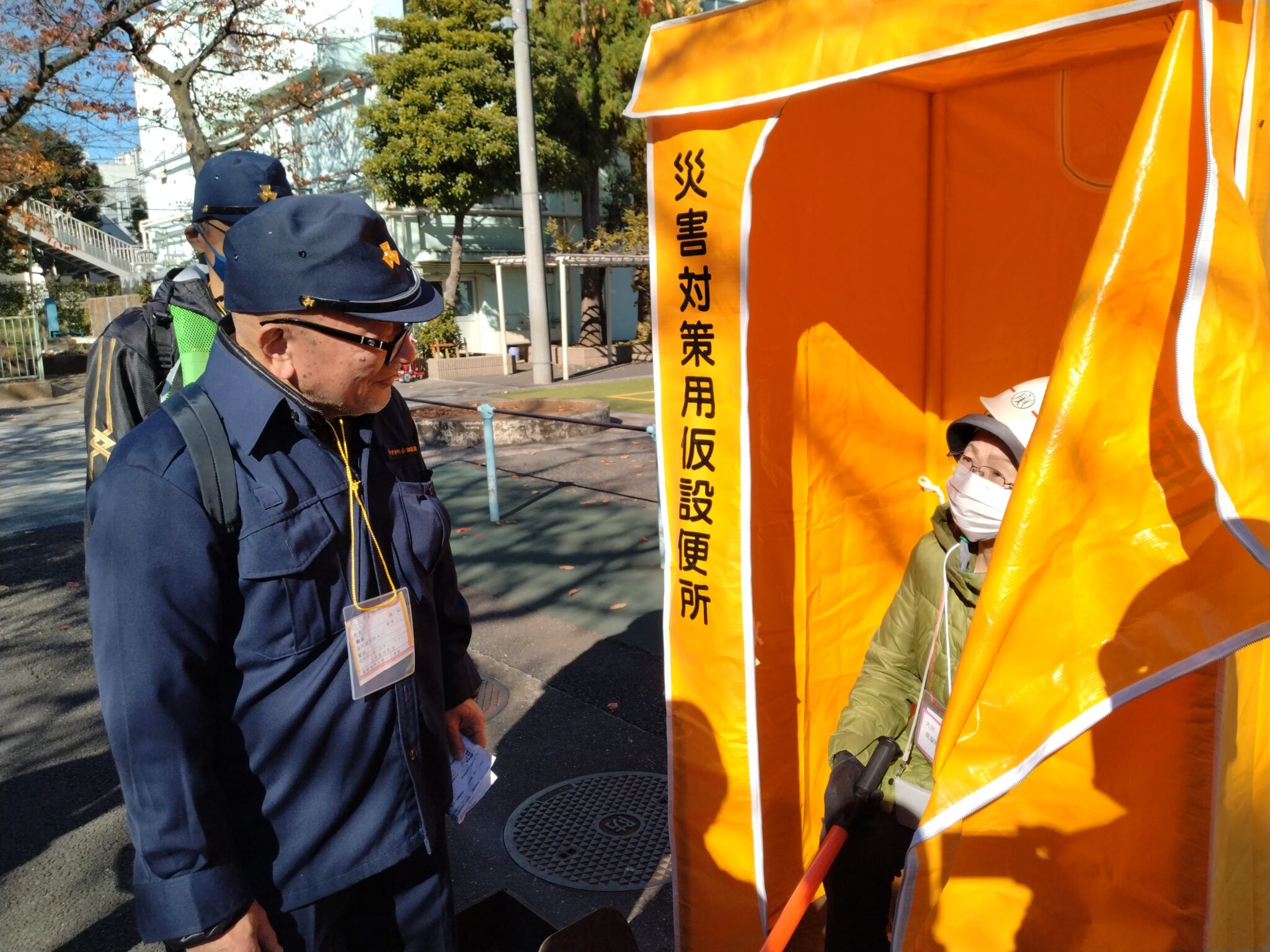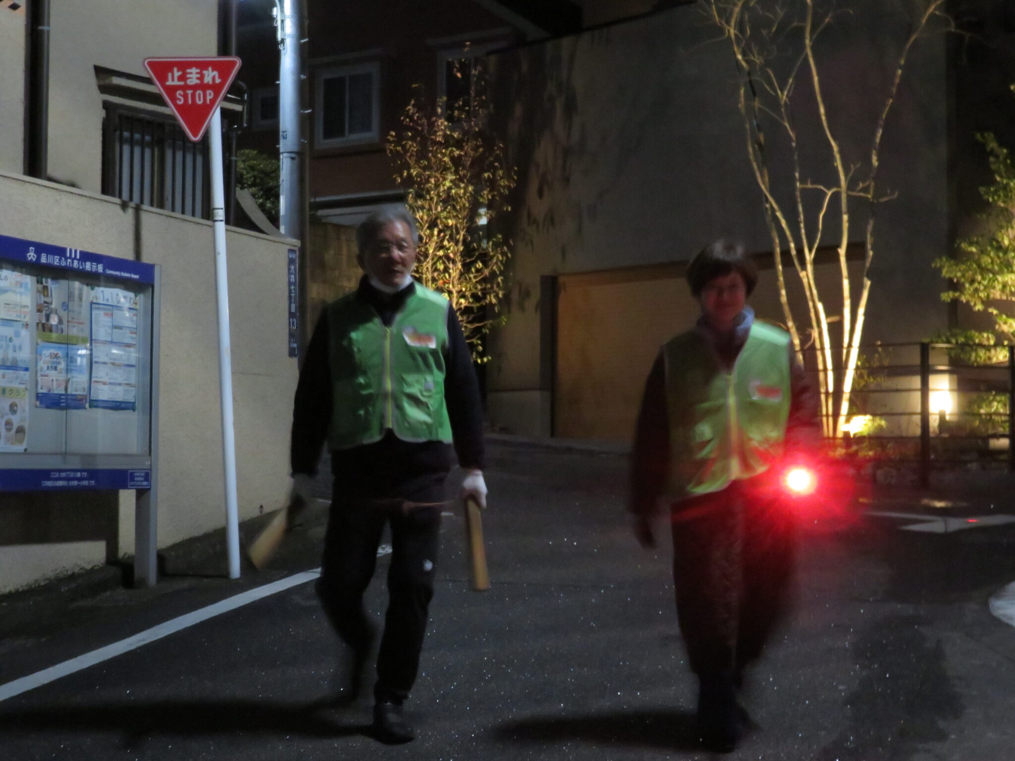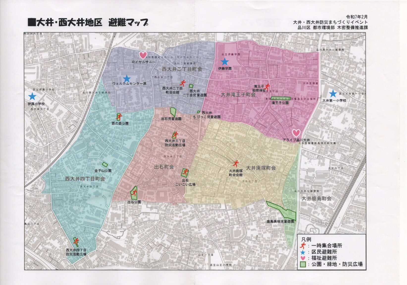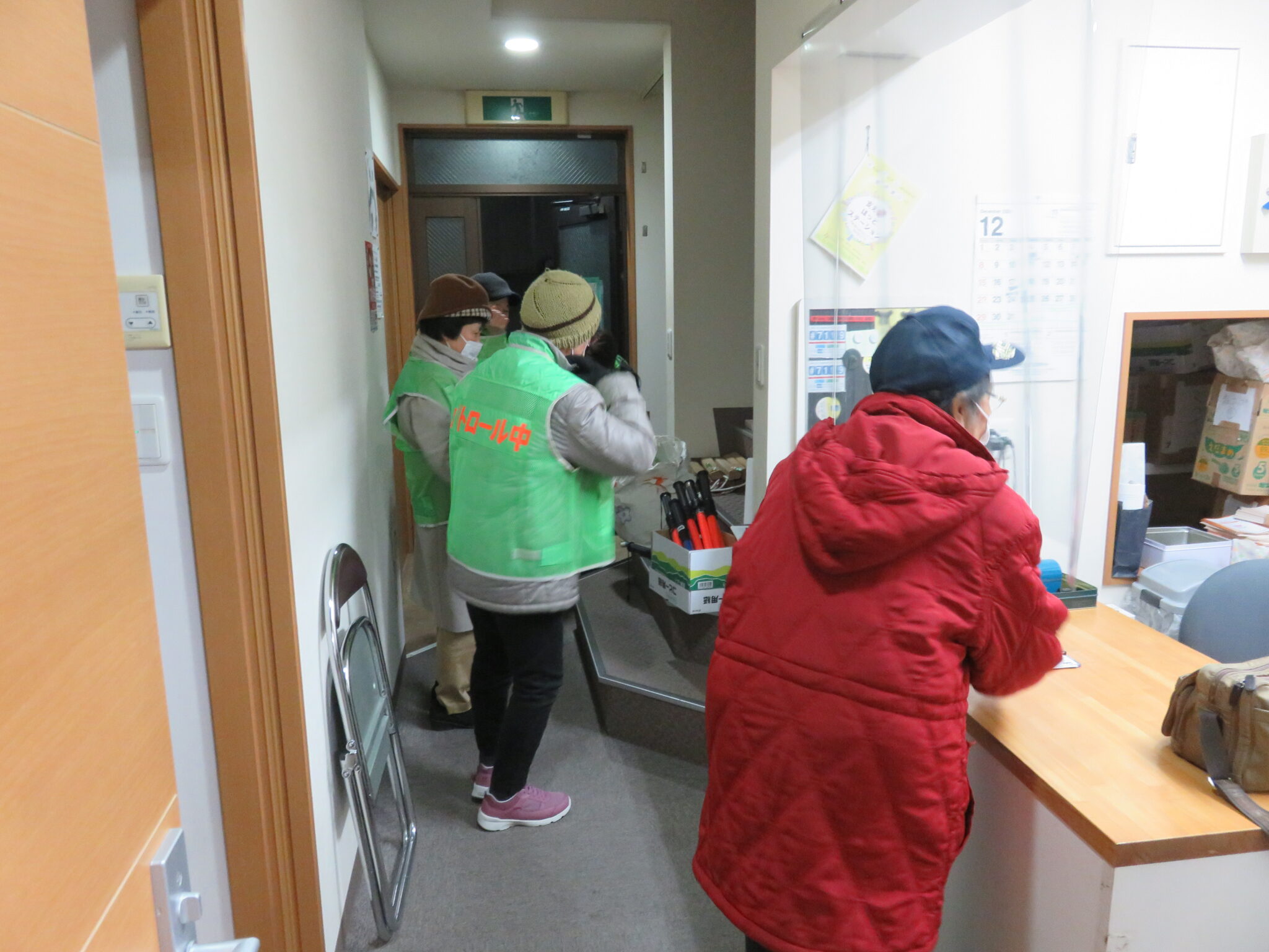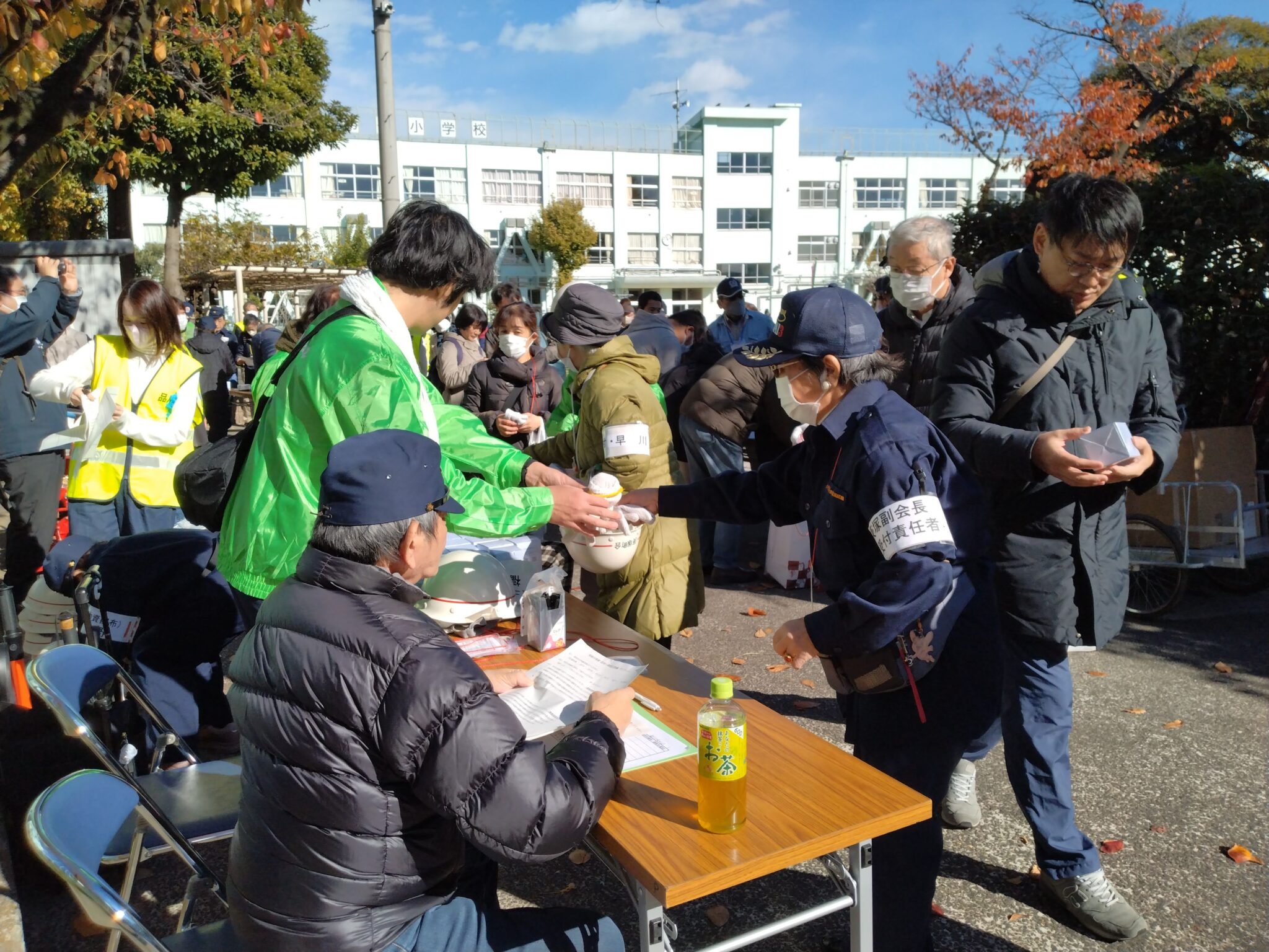 庚塚町会会館で、参加者へ大井庚塚町会の一時集合場所を案内していました。