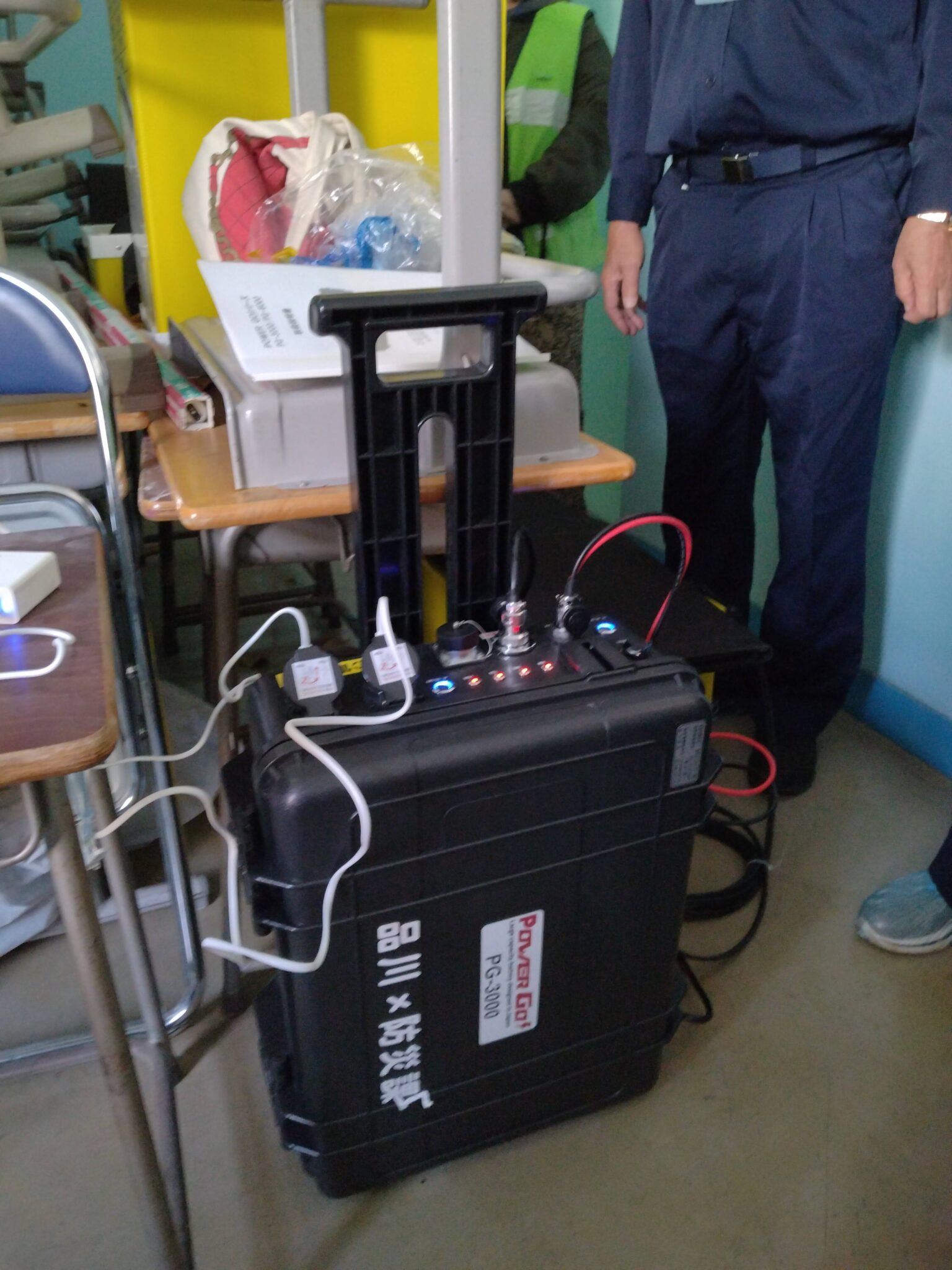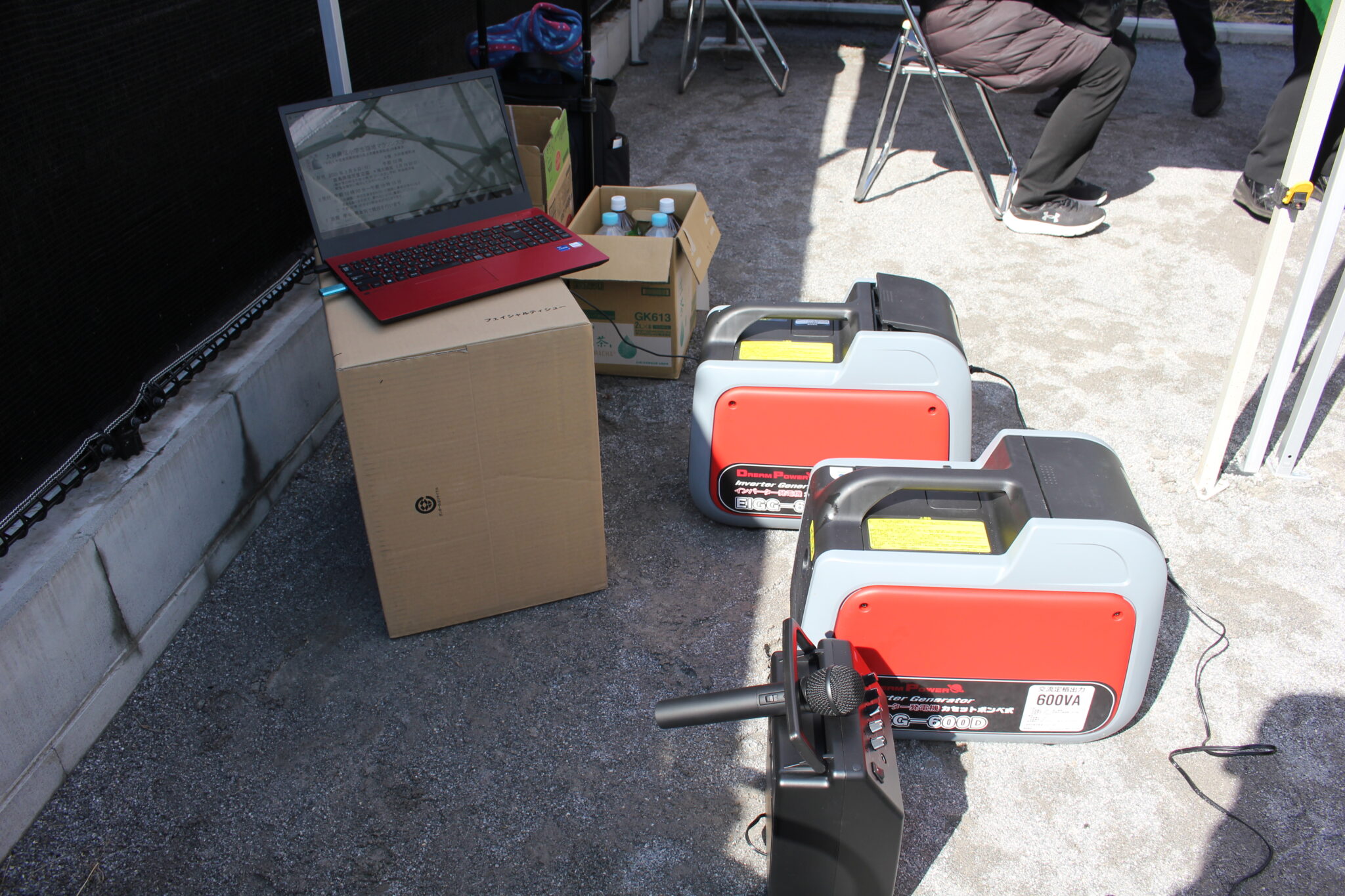 この助成金にてガスボンベ式の発電機を2台購入したのです。1台はパソコン用、1台は拡声器の電源として利用しました。