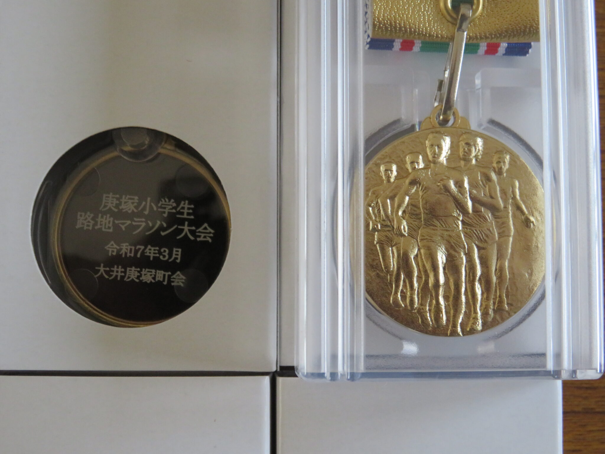今年のメダルです。これは金メダル、銀、銅とあります。メダルの裏にマラソンの情報を入れました。