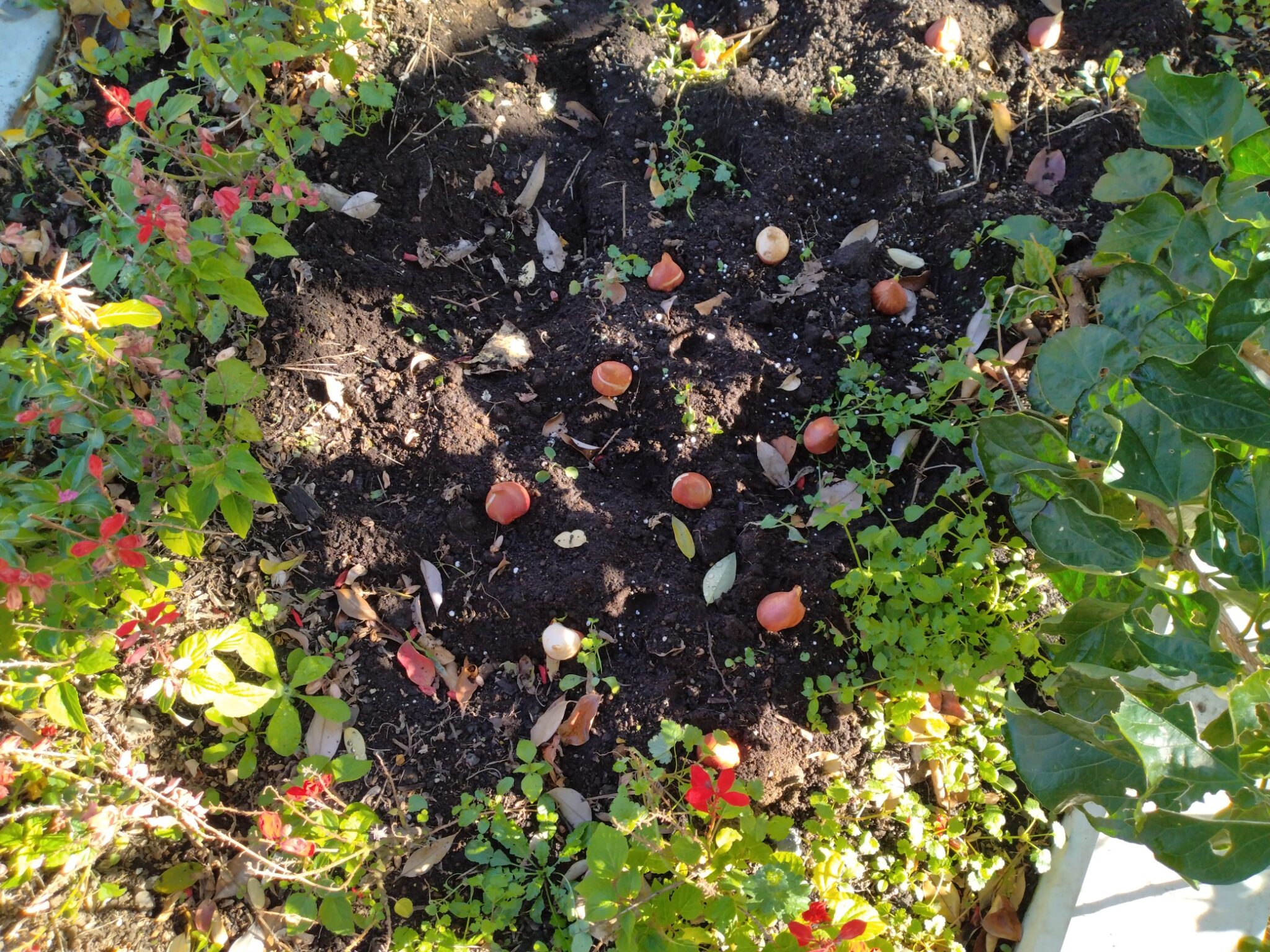 植え方はよく見る直線状に植えるのではなくランダムに植えました。各色毎に集めましたので来年の開花が楽しみです。一応道路側から黄色、白色、赤色・・・のはずですのでご期待ください。