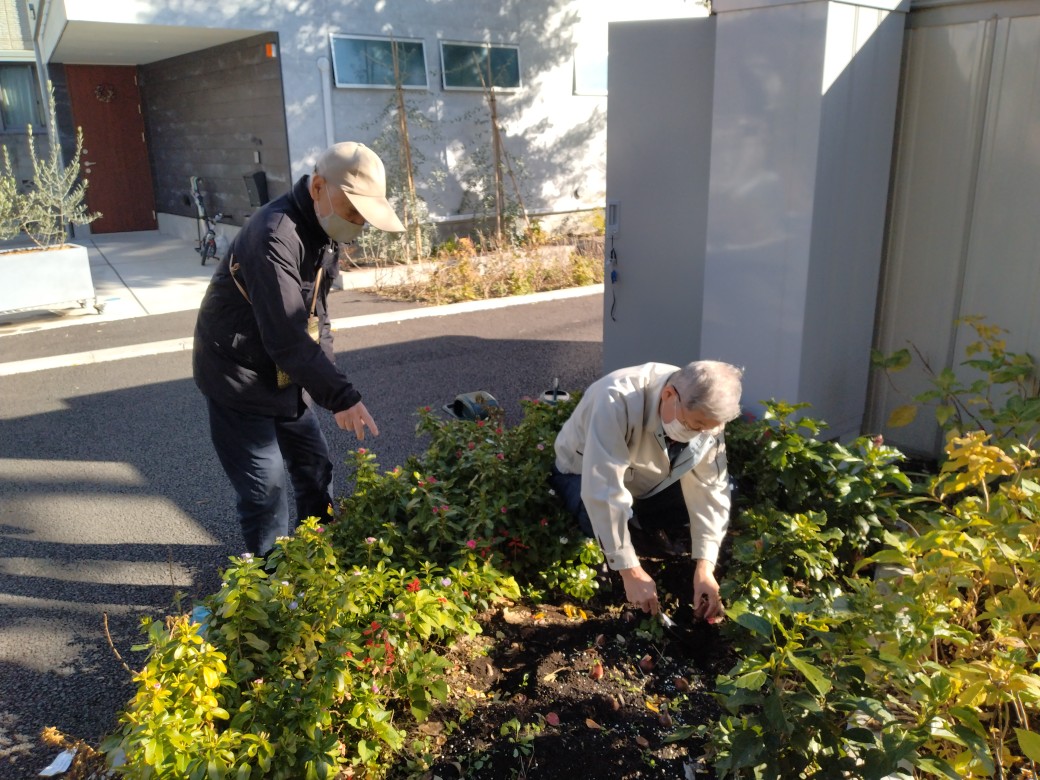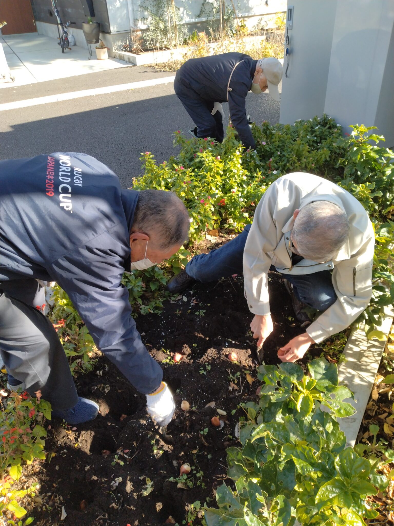庚塚・鹿島児童遊園にある庚塚町会の花壇に、庚塚ガーデニングクラブのメンバーがチューリップの球根を植えました。