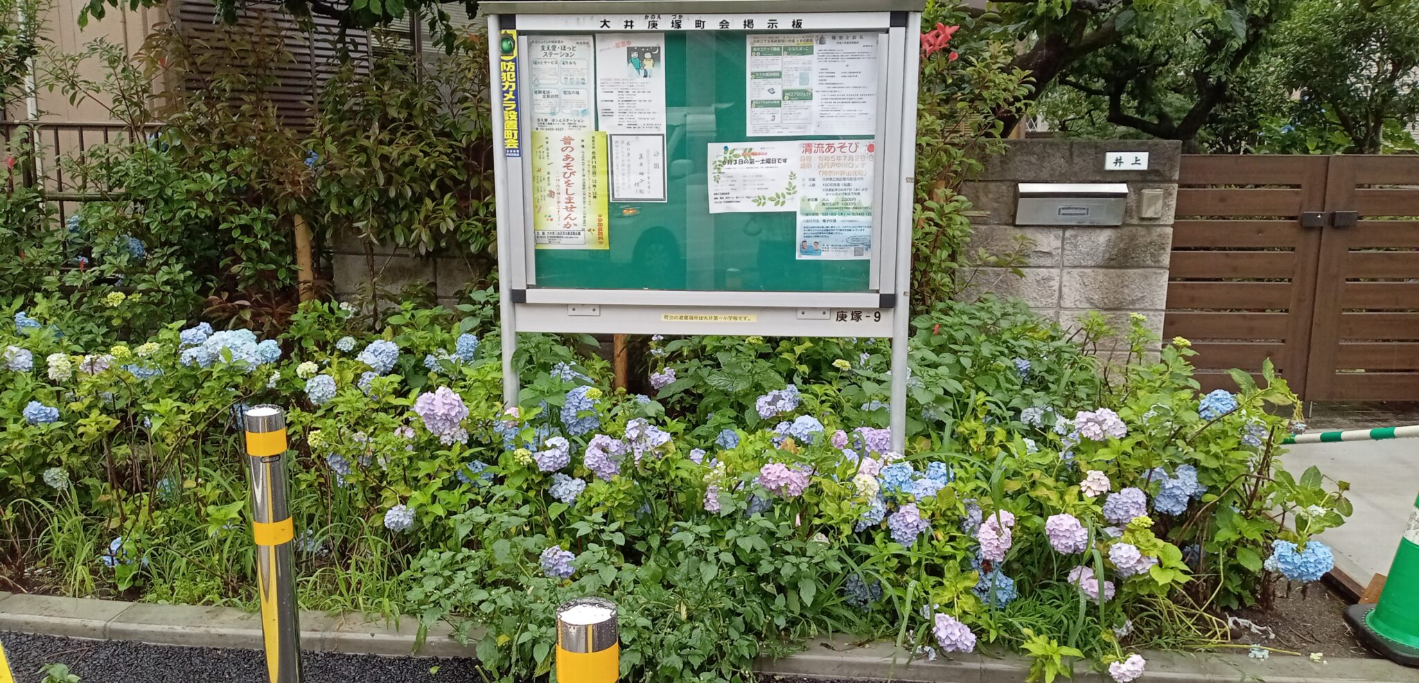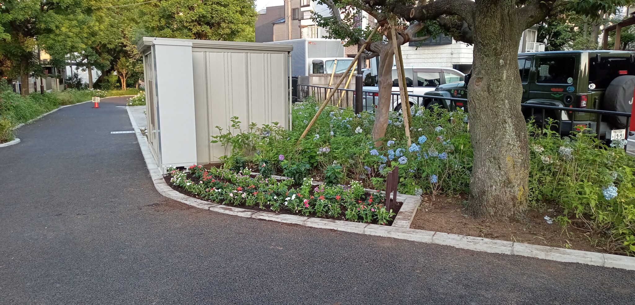 因に、この花壇は大井庚塚町会の防災倉庫に隣接した花壇です。